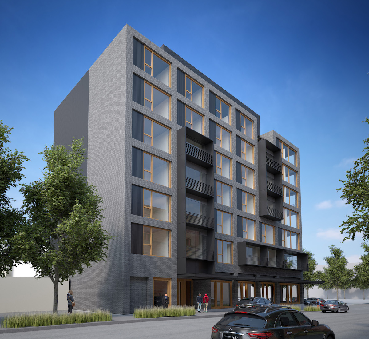In response to comments received at the project’s first Design Advice hearing the height of the building has increased to 75′ with 7 stories, while the projecting elements over NW 13th Ave have been removed. The primary material for the building has changed to a medium gray brick with metal accents.