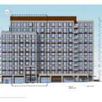 Other materials proposed include metal panel in two colors, aluminum storefront, VPI vinyl windows and glass balcony railings.
